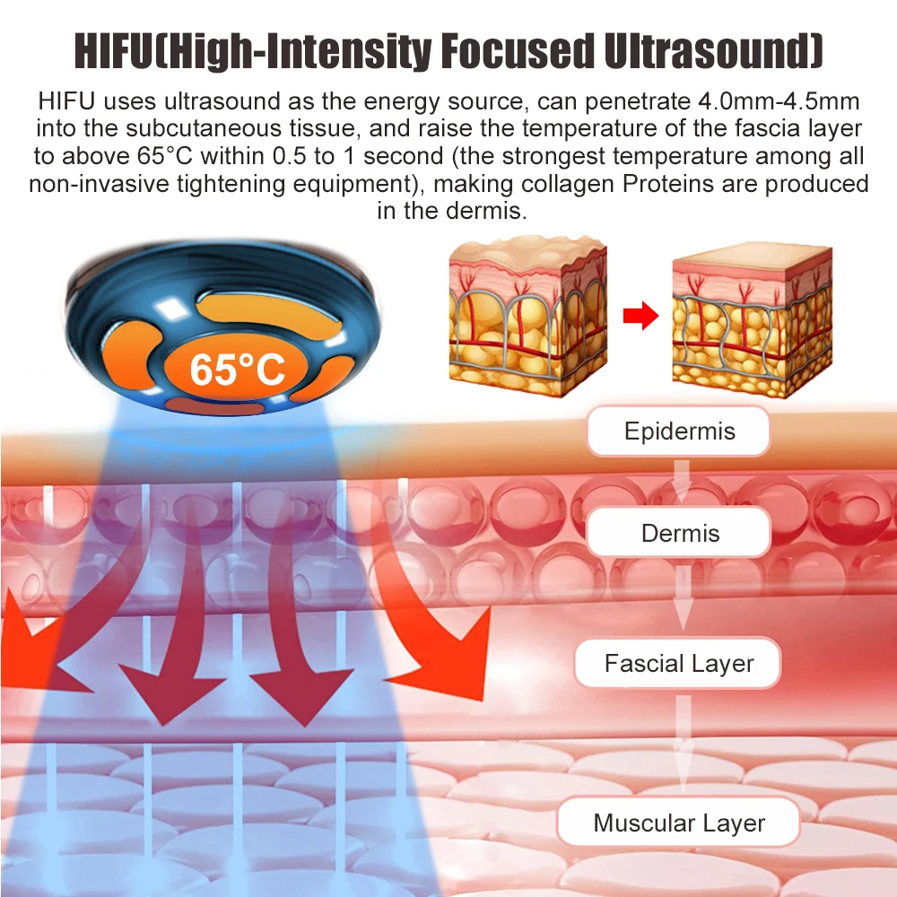 HIFU (High-Intensity Focused Ultrasound) is a non-invasive (non-traumatic) ultrasonic technique directly acting on the fascia layer. With ultrasonic waves as the energy source, HIFU makes use of its penetrability and focus ability to focus the ultrasonic energy emitted by ultrasonic waves on the fascia layer of the human body. It forms an area with higher sound intensity within the fascia layer. It may go deep into subcutaneous 4.0mm-4.5mm, elevate the temperature of the fascia layer tissue to over 65°C (the strongest temperature of all non-invasive firming equipment) within 0.5 to 1 second, so as to make collagens within the fascia layer tissue regroup and not damage the normal tissue beyond the focus area, and further improve the fascia.